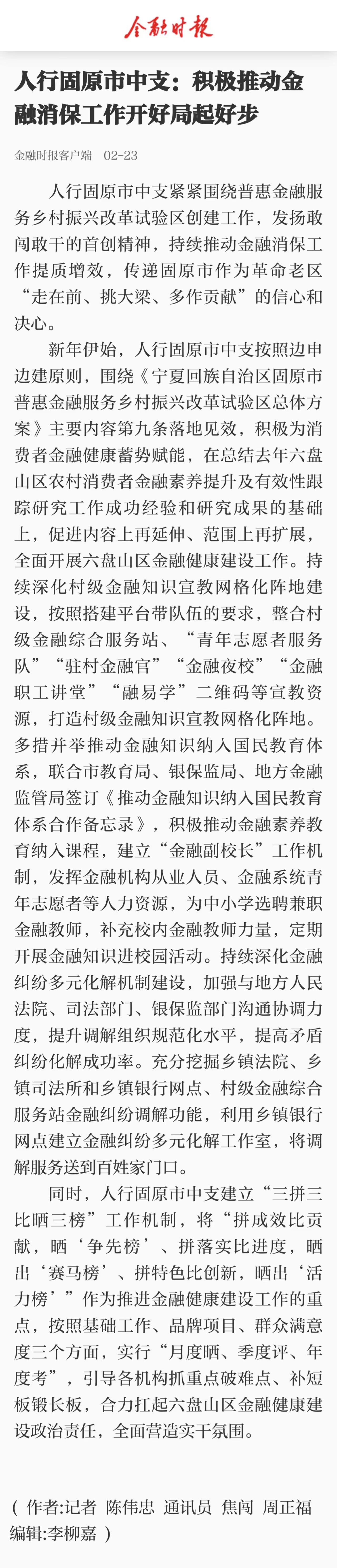 2023年2月23日《人行固原市中支:积极推动金融消保工作开好局起好步》时报客户端