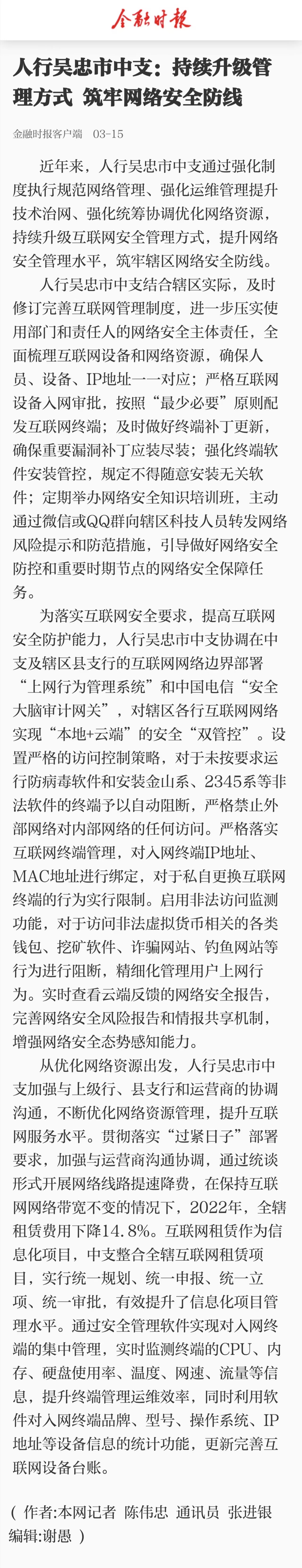 2023年3月15日《人行吴忠市中支:持续升级管理方式 筑牢网络安全防线》时报客户端