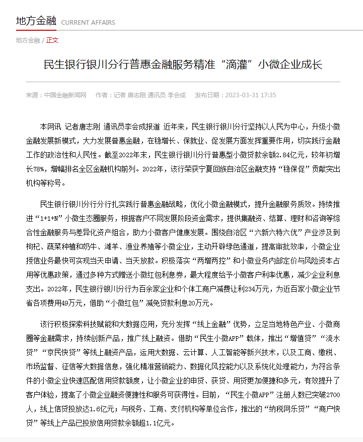 2023年3月31日《民生银行银川分行普惠金融服务精准“滴灌”小微企业成长》网站